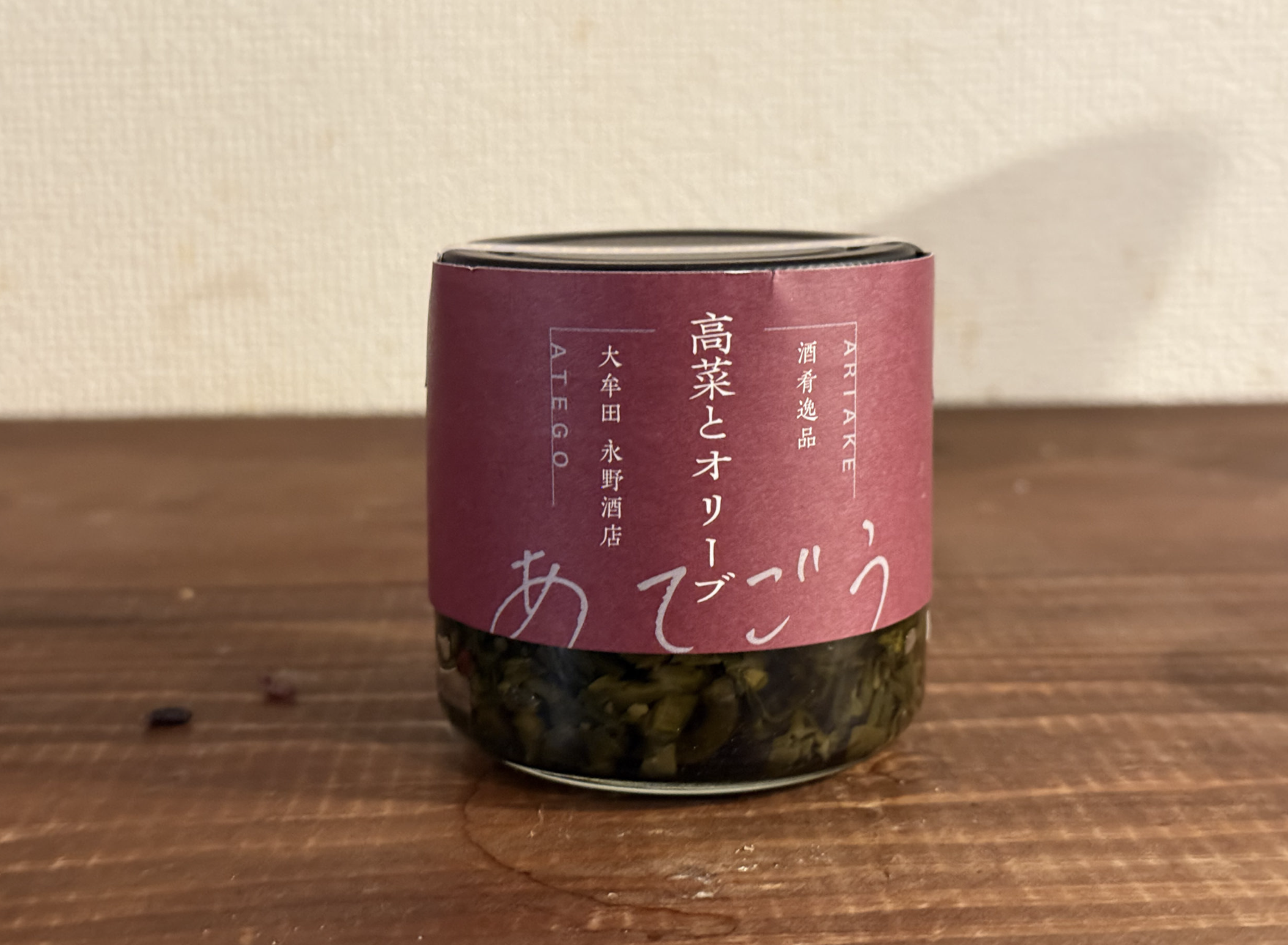 永野酒店オリジナル「あてごう」– 高菜×オリーブの洗練されたおつまみ