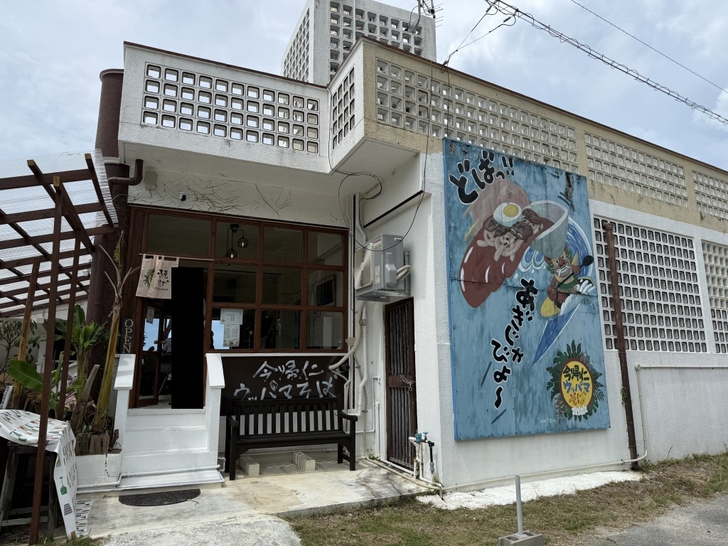 ウッパマビーチのすぐそば。テラス席からコバルトブルーの海を一望しながら、コシ強めの自家製平麺をすすれます。開放感たっぷりなのでビーチ遊びの前後に立ち寄るのもあり。