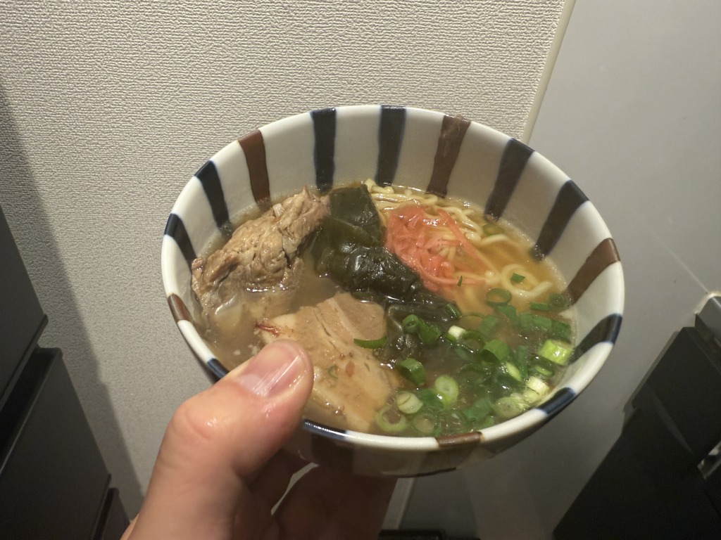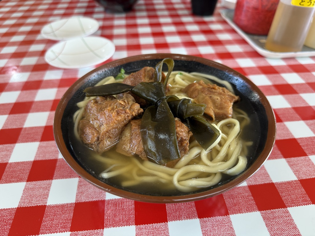 軟骨まで食べられるとろっとろのソーキと三枚肉が最高に美味しい。中華麺のツルツルも相まって、今帰仁ウッパマそば風になった。昆布は宮里そばインスパイアだ。