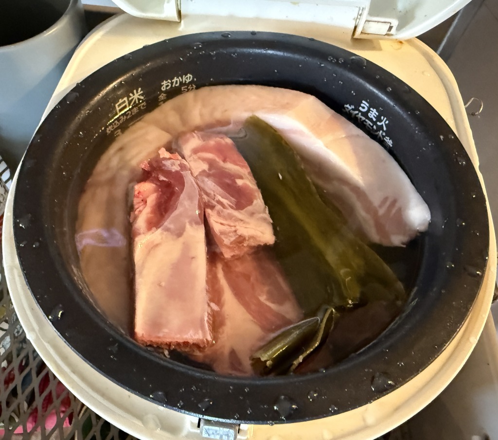 鍋に肉類と水、泡盛か焼酎、昆布を入れて普通に炊飯する。昆布は水で戻してから入れてもいいし、そのままでも良いと思う。今回一部は具材にするため結んでおいた。戻し汁はせっかくだから使いたい。