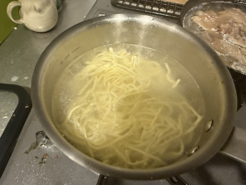 中華麺を茹でておく。これは普通に九州のスーパーで売っていたラーメン用の太めの中華麺。表面に粉がついている生タイプを選ぶと沖縄そばに近いかもしれない。